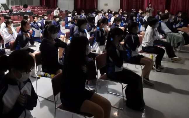 当日は説明をする十分な時間がとれないことから、生徒さんと先生方にはお昼休みを使って「笑いヨガとは何か、どんな効果があるのか」の説明と、実技の導入部分の動画を事前に観ておいていただきました。