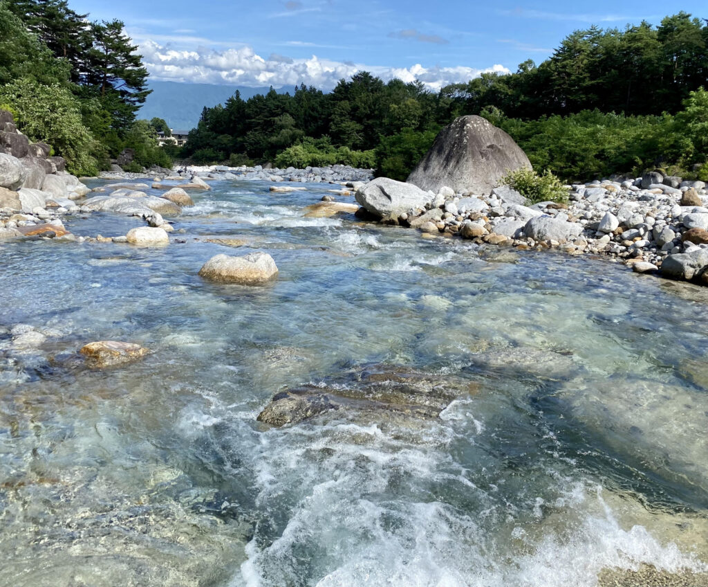 裸足で川に入るとキーンと冷たくて、気持ちよかったです♪