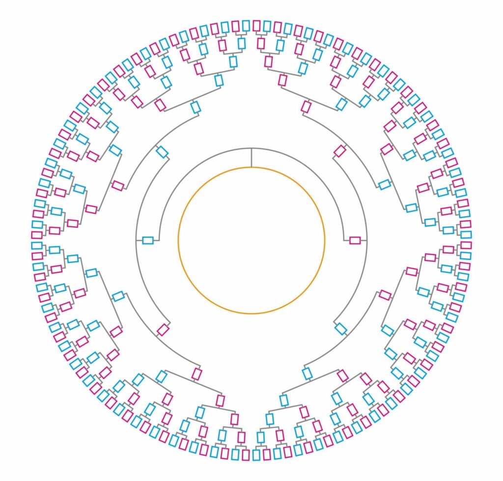 一番外側の円のところに並ぶ青と赤の男女が254人のご先祖様。